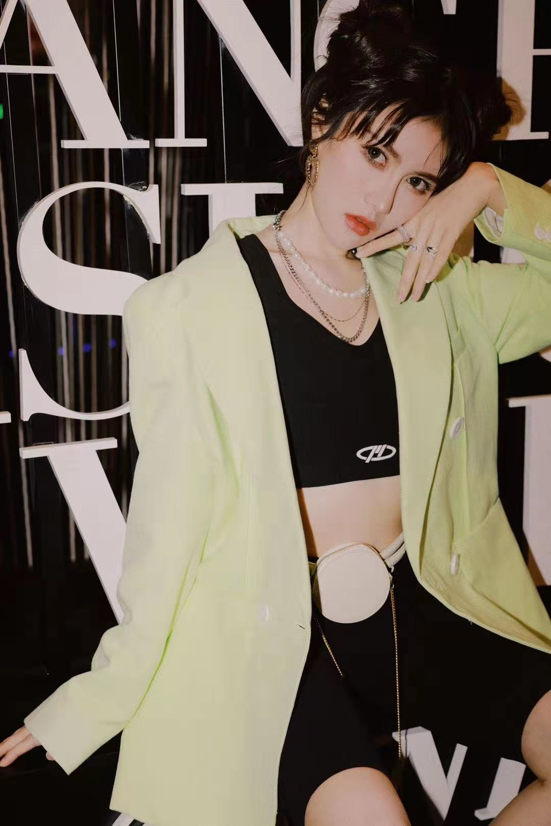 今年大热的中性风被温果希诠释的飒气十足,一套清新亮眼的绿色西服套装、紧身黑色露脐打底和中裤实力“炫”腹,看惯了果果儿长发飘飘的造型,这身A到爆的西装简直颠覆了以往形象。